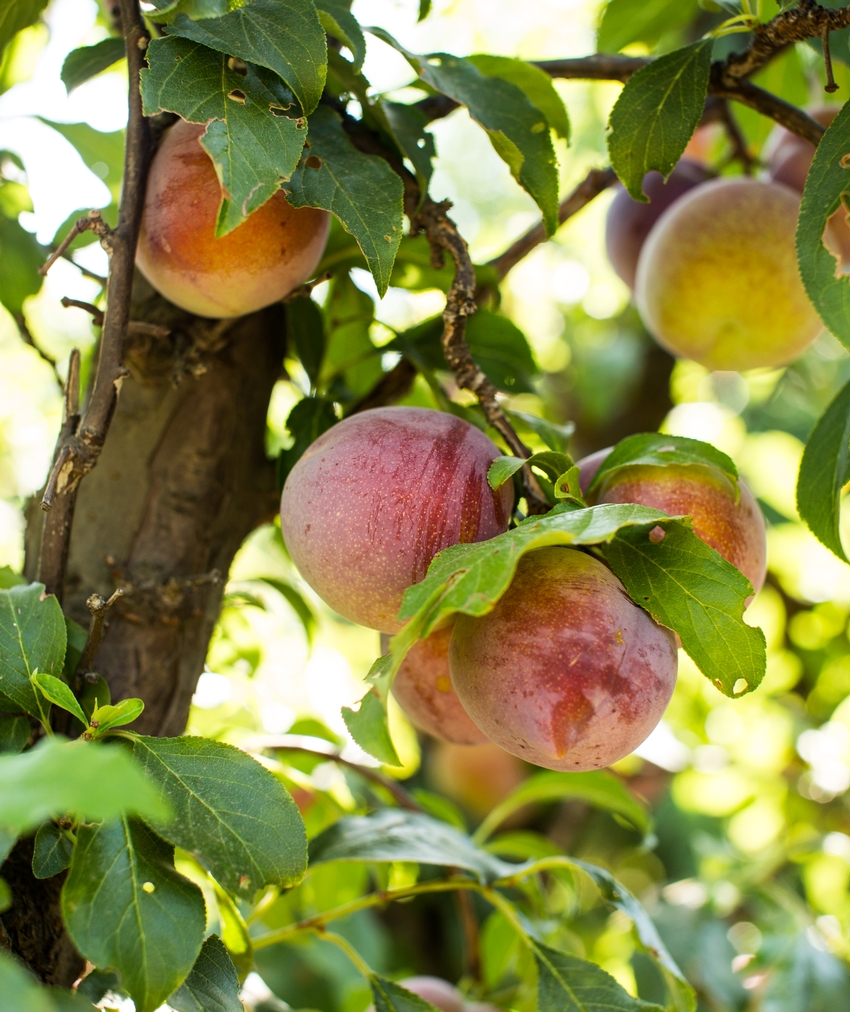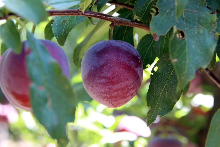Originated in Winters, California, by Claron O. Hesse, California Agr. Expt. Sta., Davis, And Agr. Res. Serv., USDA. Introduced in 1954. Fruit: large; somewhat heart-shaped, tendency to have a slightly irregular surface; skin develops a full deep mahogany before shipping maturity. Flesh is light amber in color, no red nest to skin, firm, sweet, texture and quality very good, aroma not pronounced; hold in storage for rather long periods of time; ships very well; ripens late, about with President. Trees are somewhat weak but better than Gaviota, appearing to be more vigorous an established peach or budded on Marianna 2624 rootstocks than when top worked to establish Santa Rosa and Duarte trees. Susceptible to internal browning. A good backyard cultivar. |